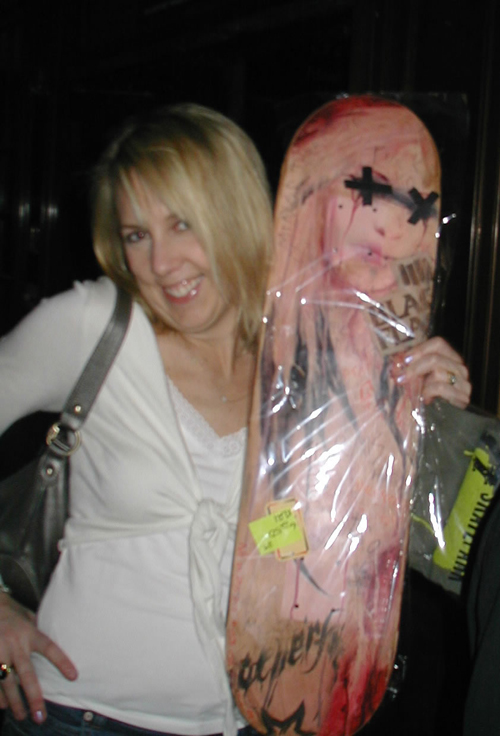 Mary Al, happy owner of a new Black Flag skateboard